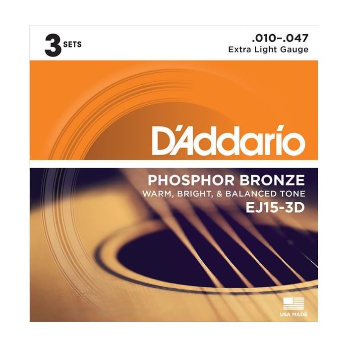 Description / D'Addario EJ15-3D Phosphor Bronze Acoustic Guitar Strings, Extra Light, 3 Sets