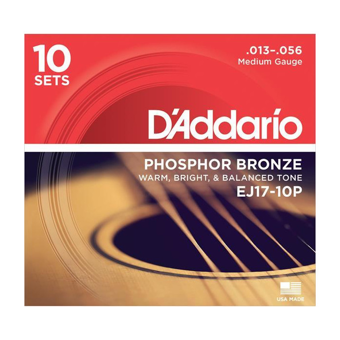 Description / D'Addario EJ17-10P Phosphor Bronze Acoustic Guitar Strings, Medium, 13-56, 10 Sets