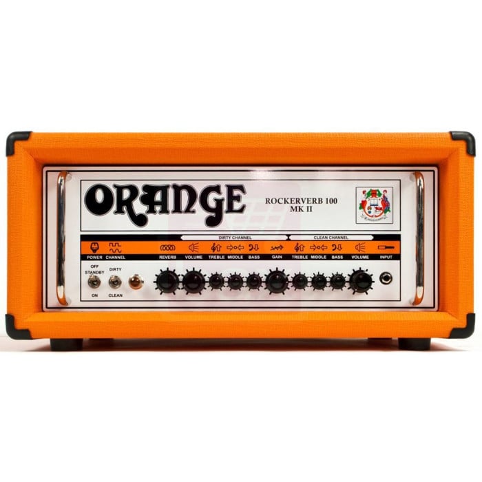 The Rockerverb 100 is an all-valve, 100-watt channel switching head with a valve FX loop and valve-driven reverb. It has a two-stage clean channel and a four-stage dirty sound. The bass and treble controls are interactive, providing a wide range of tones from a channel with only three controls. The dirty channel can produce anything from a clean chime to classic rhythm/crunch sounds with original Orange character, all the way up to an outrageous gain level. The quartet of 6V6 output valves and a new exclusive F8 output transformer design give the Rockerverb 100 its uncompromising tone. It has footswitchable channels, reverb control, and an output of 100w (RMS).
